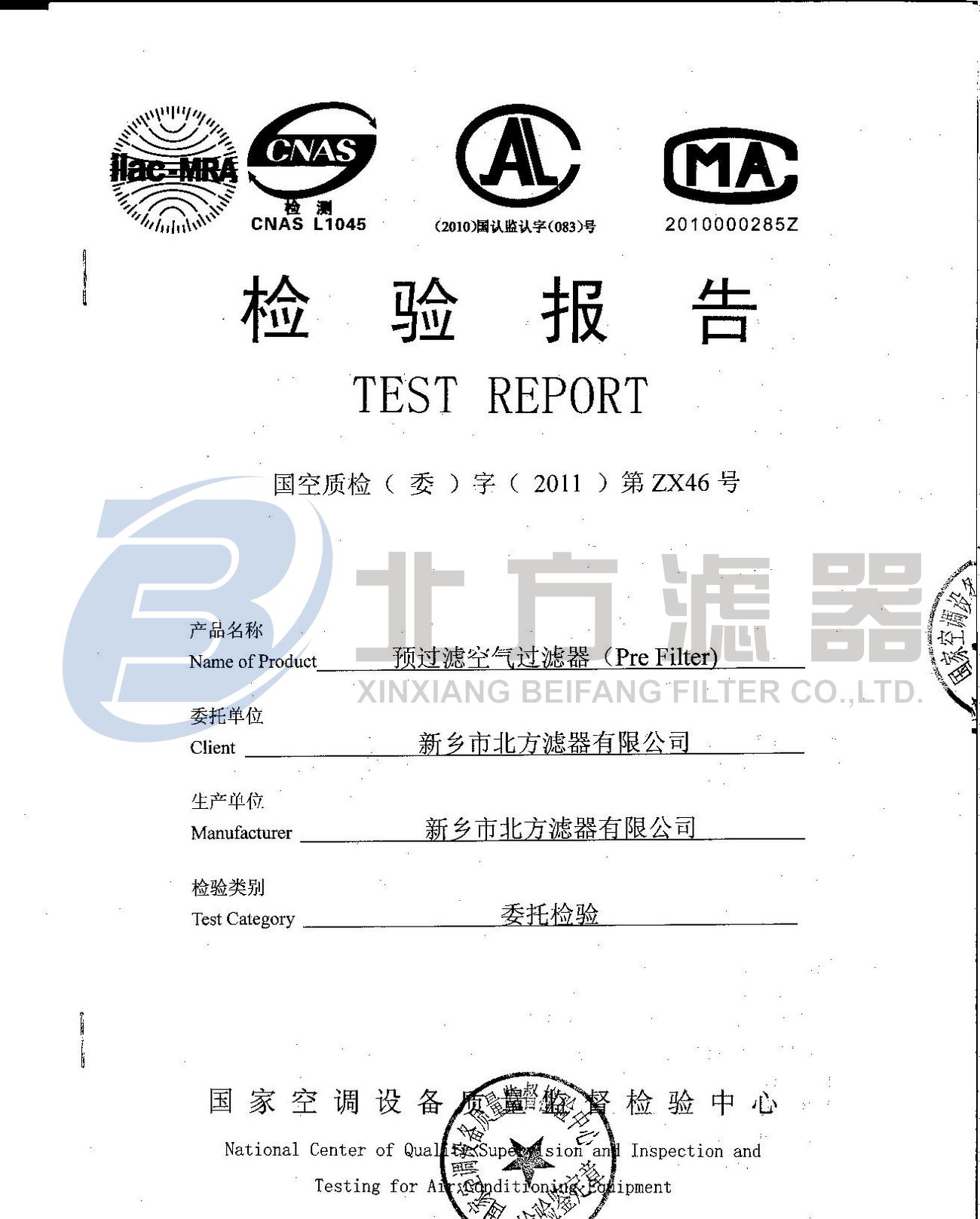 當前位置 : 主頁 > 關于我們 > 榮譽資質 -預過濾空氣過濾器檢測報告