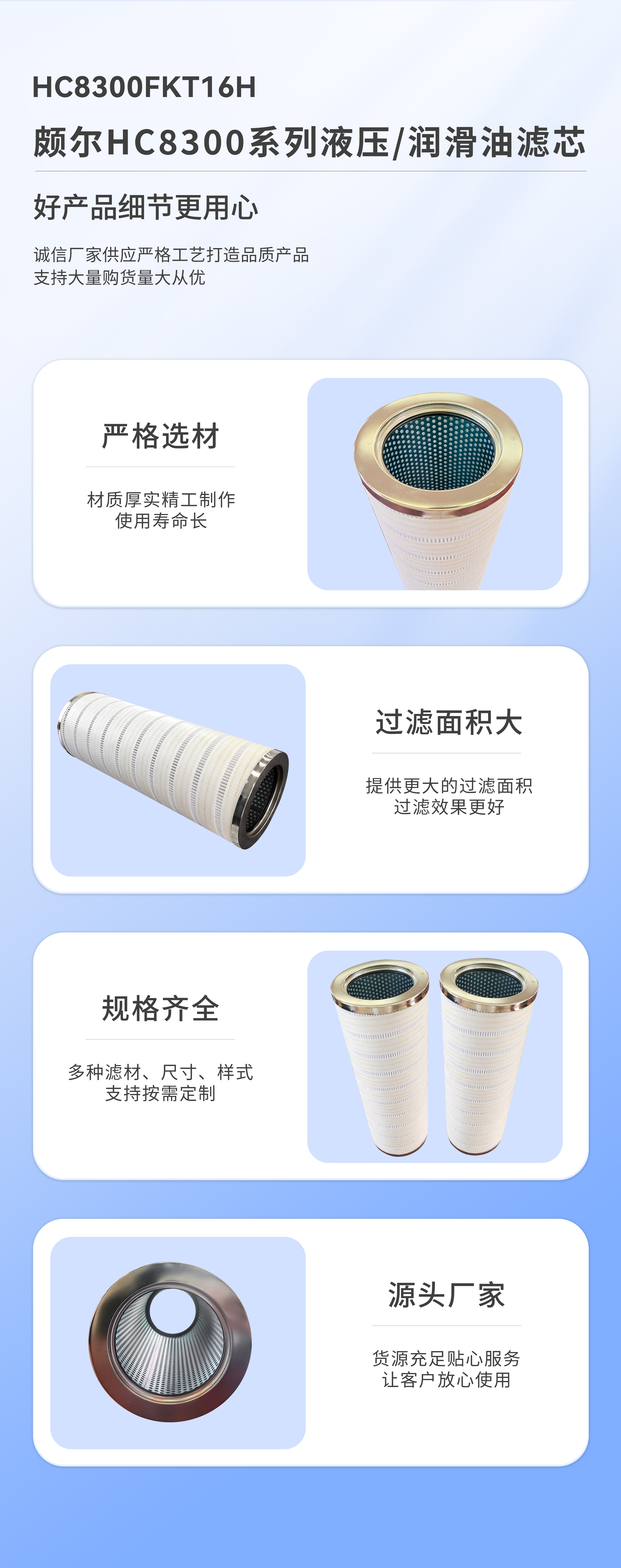 【產(chǎn)品簡介】: 頗爾濾芯HC8300系列用于液壓、潤滑系統(tǒng)的壓油過濾,用以濾除系統(tǒng)中污染物,系統(tǒng)的正常運行,公司生產(chǎn)的濾芯采用的是進口濾材,具有的技術(shù)含量,納污除塵的性能較強,完全可以替代進口的濾芯使用。